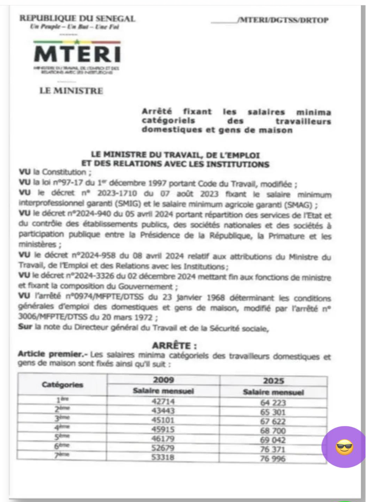 C’est pourquoi nous respectons strictement l’arrêté ministériel du Ministère du Travail, de l’Emploi et des Relations avec les Institutions fixant les nouveaux salaires minimums catégoriels pour les travailleurs domestiques et gens de maison, applicables en 2025.